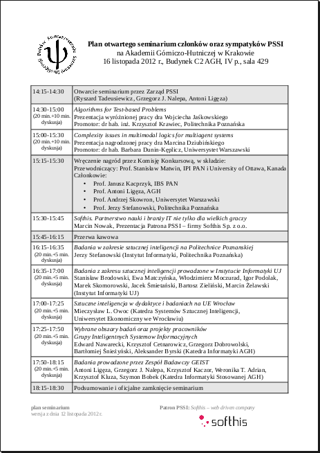 Seminarium odbędzie się w sali 429 budynku C2 AGH. Planowana godzina rozpoczęcia: 14:15.